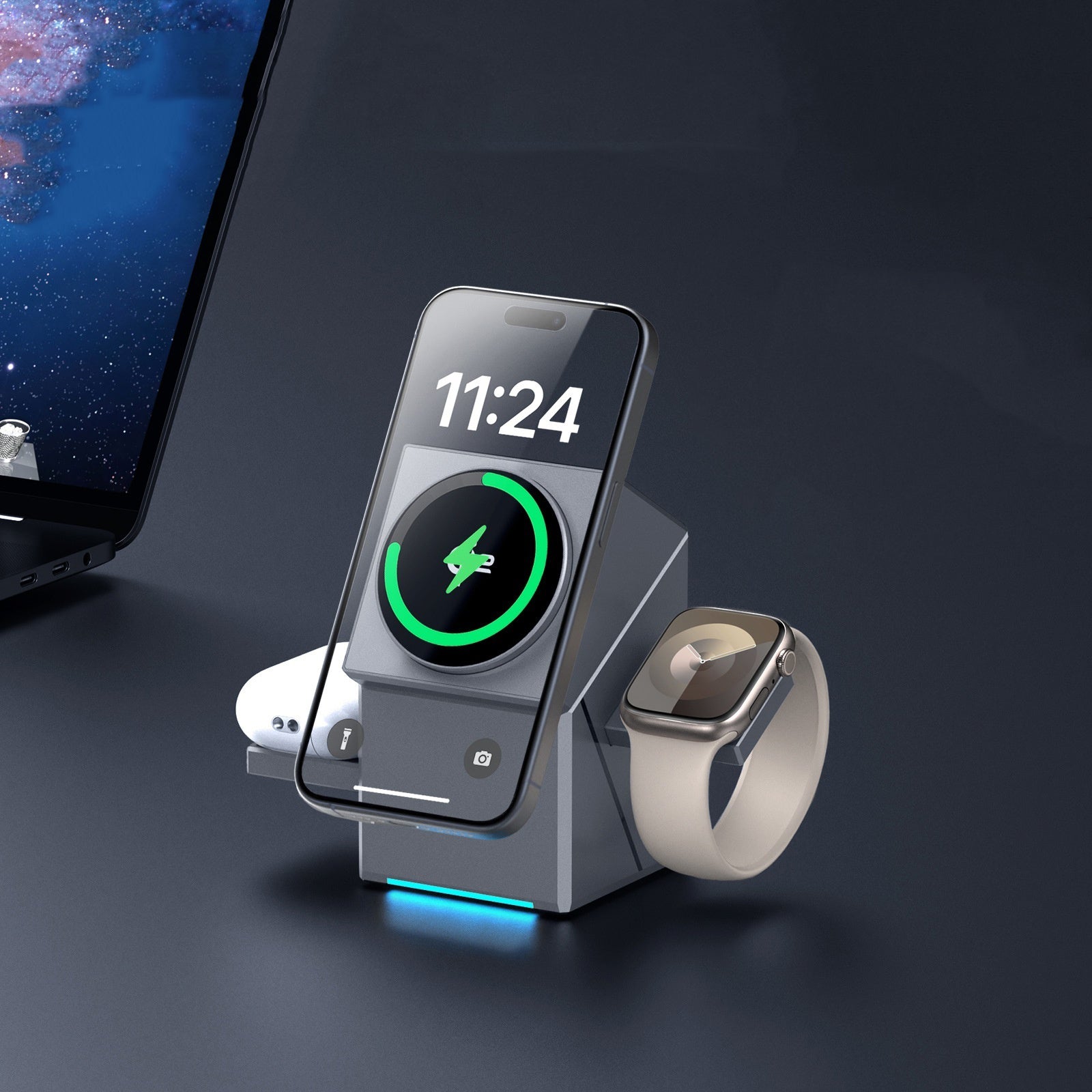 To charge your device, simply place it on the magnetic charging pad. The magnetic rotating design allows you to adjust the angle of the charger for better convenience and easy access.